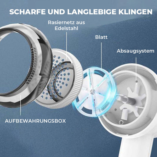 Doppelte Reinigungseffizienz Ausgestattet mit einer verbesserten Klinge aus rostfreiem Stahl und einem leistungsstarken Motor verdoppelt dieser Fusselrasierer die Reinigungseffizienz im Vergleich zu herkömmlichen Modellen. Das Edelstahlgewebe verfügt über unterschiedliche Lochgrößen, um verschiedene Flusenbällchen effektiv aufzunehmen und so eine schnelle und gründliche Reinigung ohne Rückstände zu gewährleisten.