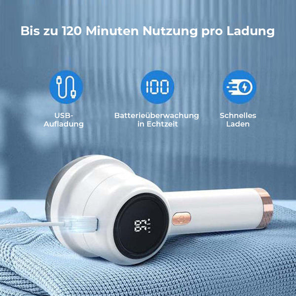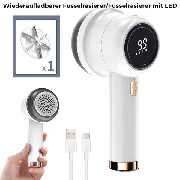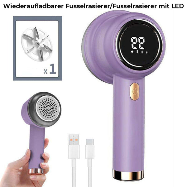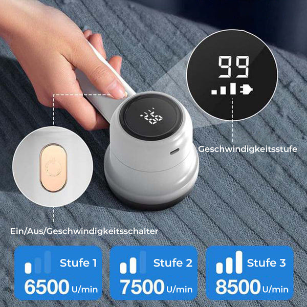 Wiederaufladbares Bügeleisen mit digitaler LED-Anzeige Erleben Sie den Komfort unseres fortschrittlichen Fusselrasierers, der mit einem hochauflösenden Display ausgestattet ist, das die verbleibende Akkuleistung, Geschwindigkeitsstufen und den Ladestatus anzeigt.