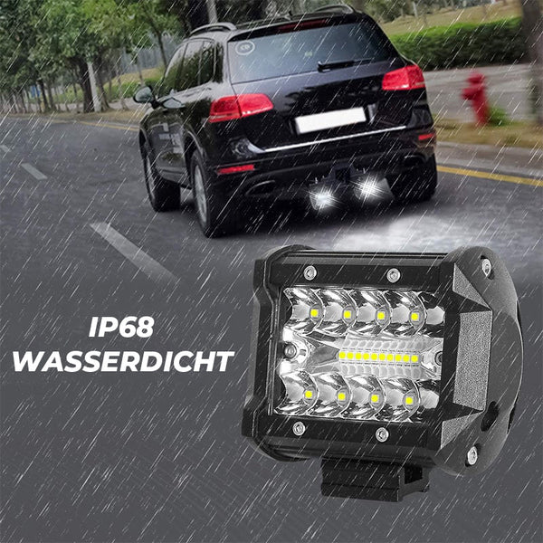 IP68 wasserdicht und wetterbeständig: Dank wasserdichtem Gummipolster und Silikondichtung für zusätzlichen Schutz ist diese LED-Leuchte regen-, staub- und wasserdicht – ideal für starke Regenfälle und Offroad-Abenteuer.
