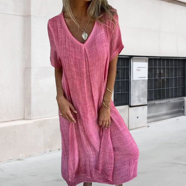 Werten Sie Ihre Garderobe mit unserem Midikleid aus Baumwolle und Leinen mit V-Ausschnitt auf!