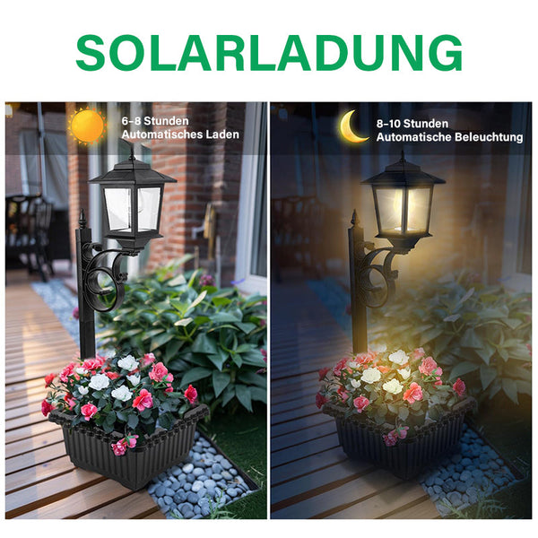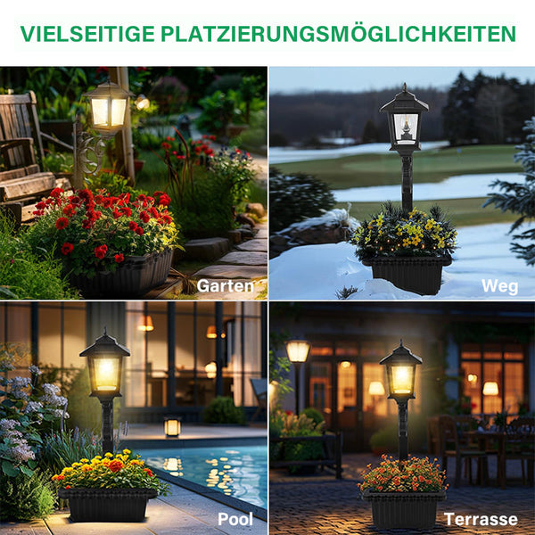 Integriertes Blumentopfdesign Am Fuß der Straßenlaterne befindet sich ein Blumentopf mit großem Fassungsvermögen, der das Einpflanzen von saisonalen Blumen, Grünpflanzen oder auch kleinen Sträuchern ermöglicht. Diese Funktion steigert die optische Attraktivität jedes Raums und verwandelt ein funktionales Beleuchtungselement in einen lebendigen Teil der Landschaft.