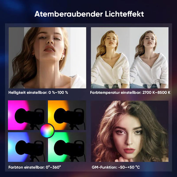 • Maximale Leistung: Diese Leuchte liefert eine maximale Leistung von 60 W und erzeugt beeindruckende 19.700 Lux in 0,5 Metern Entfernung. Das sorgt für helle, hochwertige Ausleuchtung in jeder Aufnahmesituation. Mit einem Gewicht von nur 1,0116 kg (netto) bzw. 0,85 kg (ohne Verpackung) ist sie leicht und tragbar – perfekt für Kreative, die viel unterwegs sind. Ob drinnen oder vor Ort – diese leistungsstarke Leuchte bietet professionelle Helligkeit und kreative RGB-Farboptionen in einem kompakten Format.