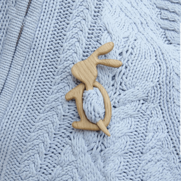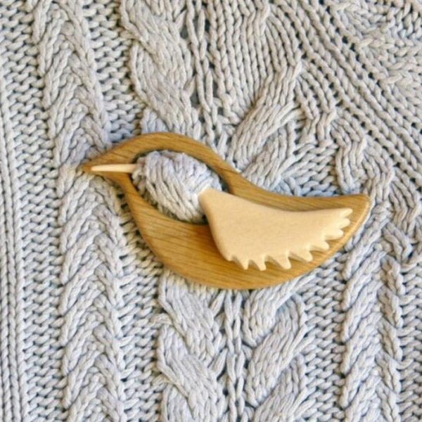 Diese Brosche mit Tiermotiv besteht aus Holz und ist vollständig handgefertigt. Es kann als Pulloverclip verwendet werden.