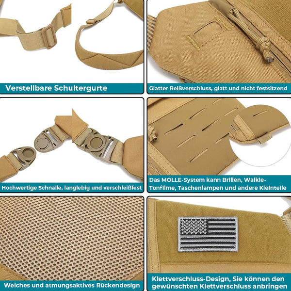 Eng anliegend und bequem, leicht zu tragen und nicht sperrig. Die vordere doppellagige Haupttasche ist kompakt genug, um einen kleinen Notizblock, Schlüssel, eine Brieftasche, ein Mobiltelefon, eine Powerbank, Ladegeräte usw. zu transportieren. Die hintere versteckte Reißverschlusstasche bietet Platz für wichtige Gegenstände wie Pässe, Dokumente usw. Das vordere MOLLE-Gurtbanddesign erhöht die Funktion des Plug-Ins und bietet Platz für eine Mini-Taschenlampe, einen Stift, ein Messer oder andere Werkzeuge.