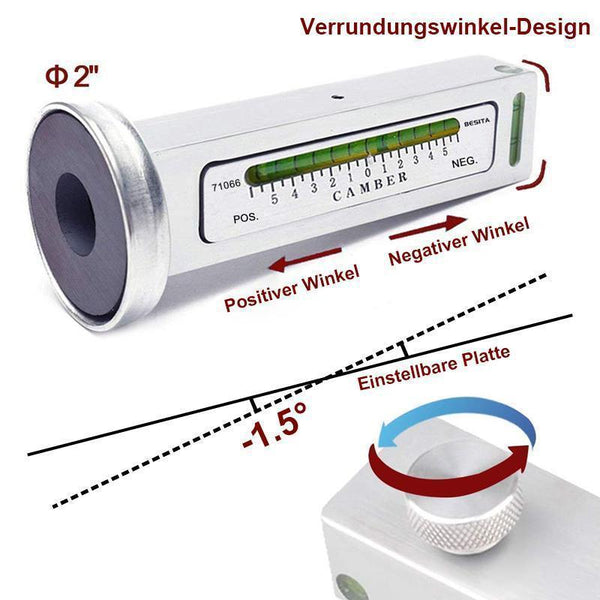 Der Pegel mit magnetischer Ausrichtung misst den Sturz- und Nachlaufwinkel an der Radnabe oder der Bremsscheibe. Es ermöglicht die Einstellung, um die korrekte Achsvermessung aufrechtzuerhalten und zu verhindern, dass Ihr Reifen vorzeitig abgenutzt wird. Es ist ein nützliches Werkzeug, um die korrekten Sturzeinstellungen nach dem Zerlegen und Zusammenbauen der Federung beizubehalten.