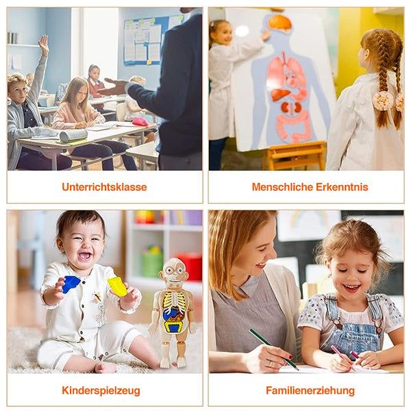 Wissenschaftliches Lernen: Die abnehmbaren und zusammengesetzten Organe ermöglichen es Kindern, die Zusammensetzung und Position der verschiedenen Organe des menschlichen Körpers dreidimensionaler zu verstehen und zu analysieren und regen ihren Wunsch nach Erforschung und Fantasie an. Es ist ein perfektes und besonderes Spielzeug für die Früherziehung!
