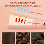 Keramische Glasur: Die mit Keramikglasur beschichtete Heizplatte hat eine gute Wärmeleitfähigkeit, die das Haar gleichmäßig erwärmen kann, ohne es zu beschädigen. So können Sie einen glatten und glänzenden Look kreieren.